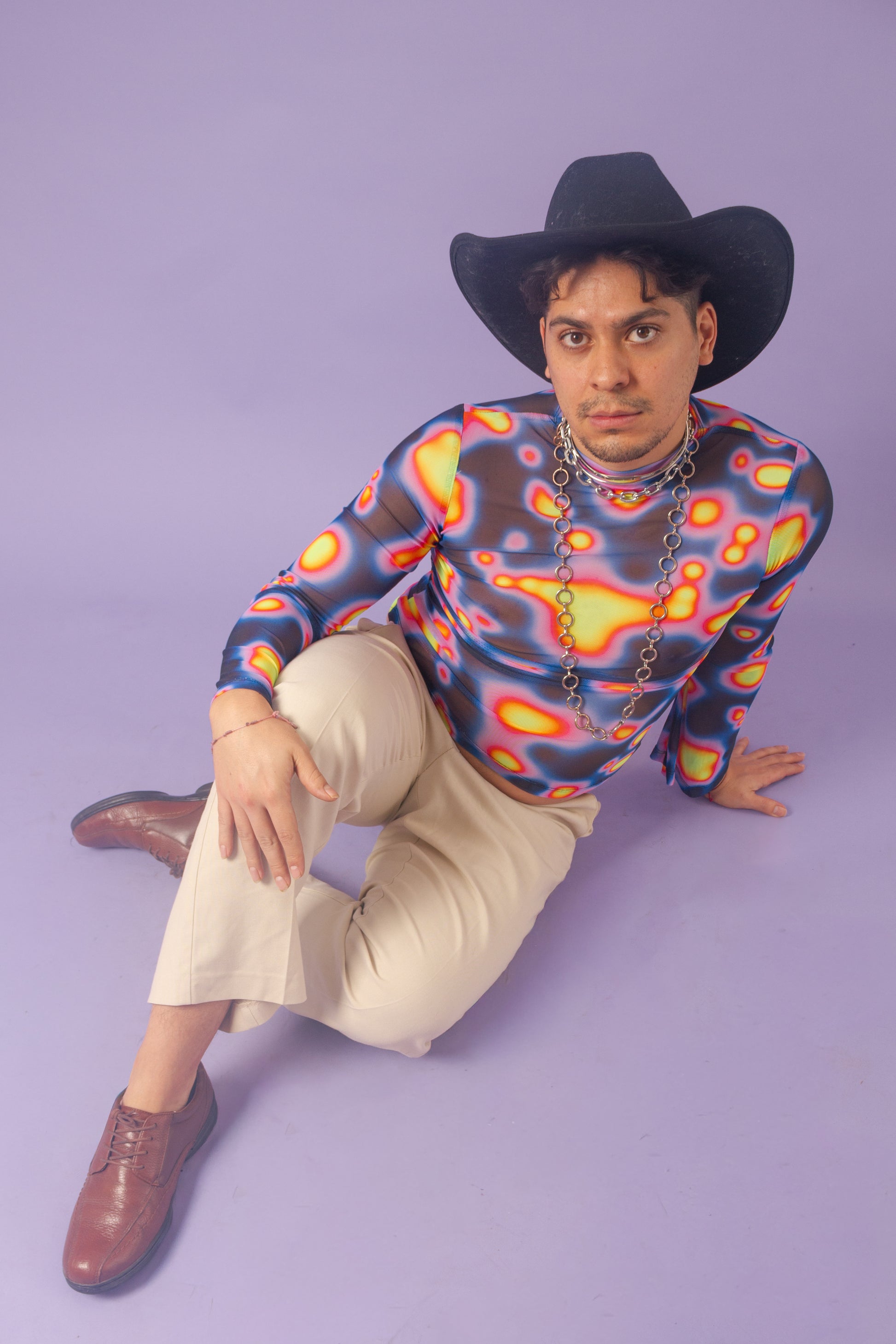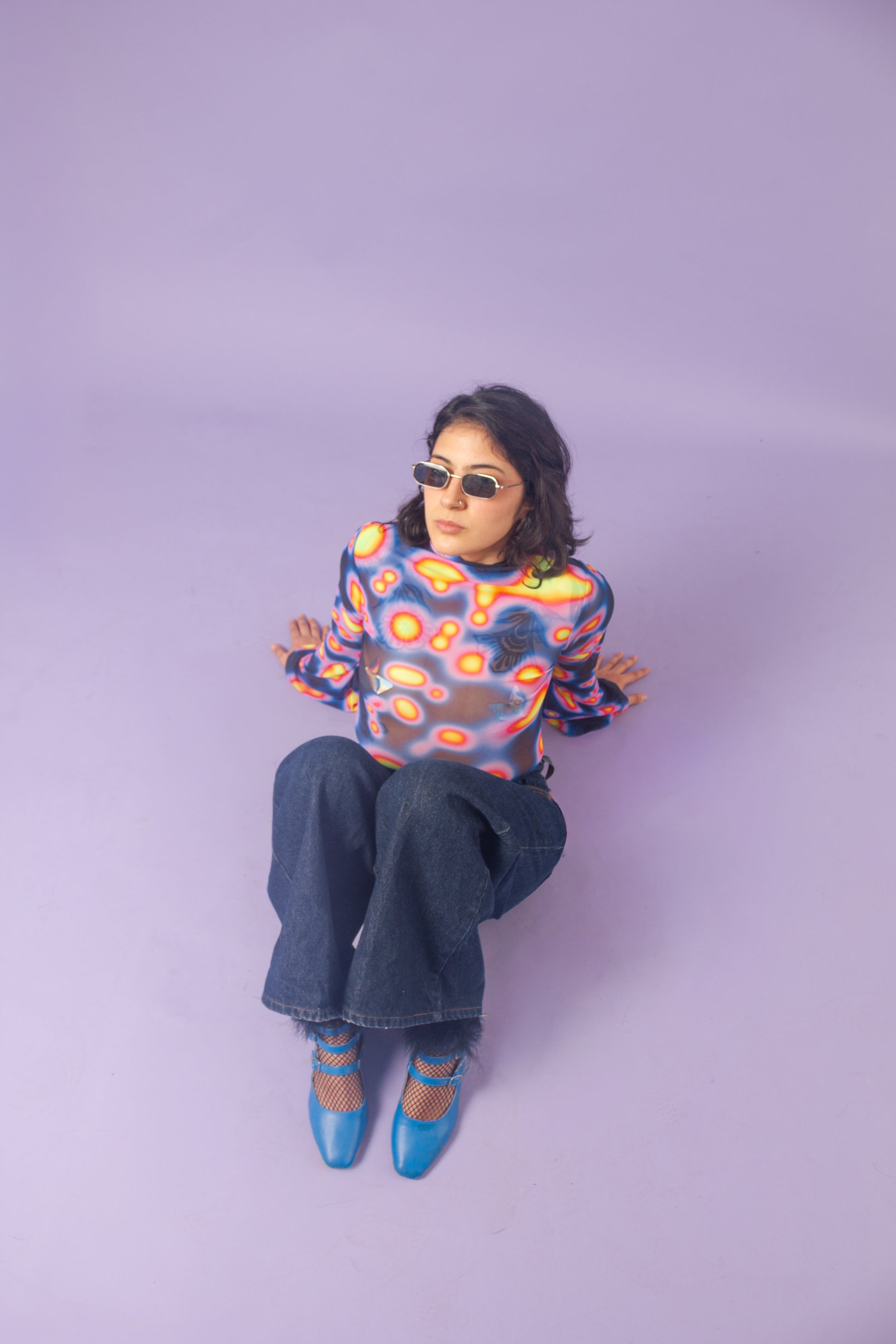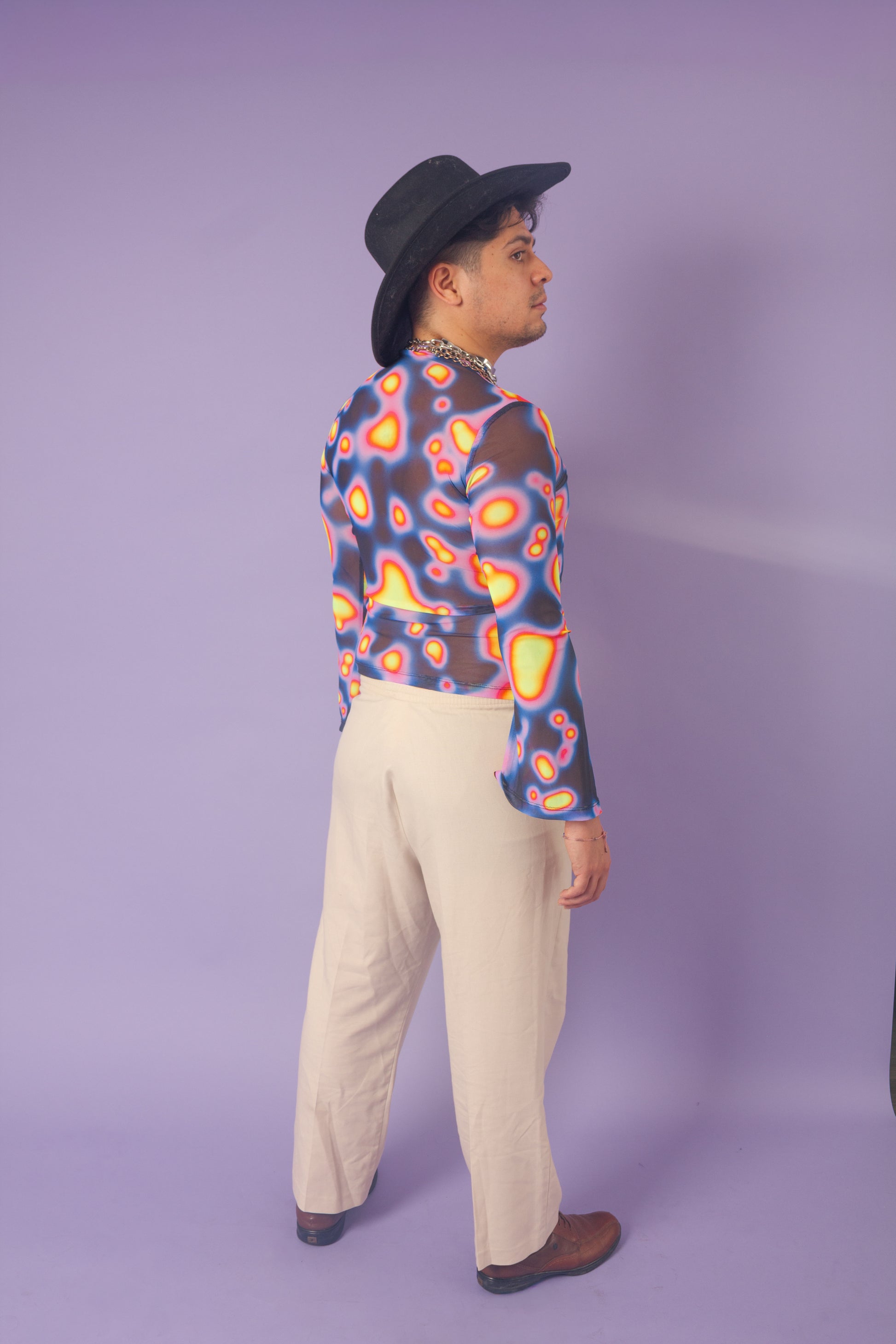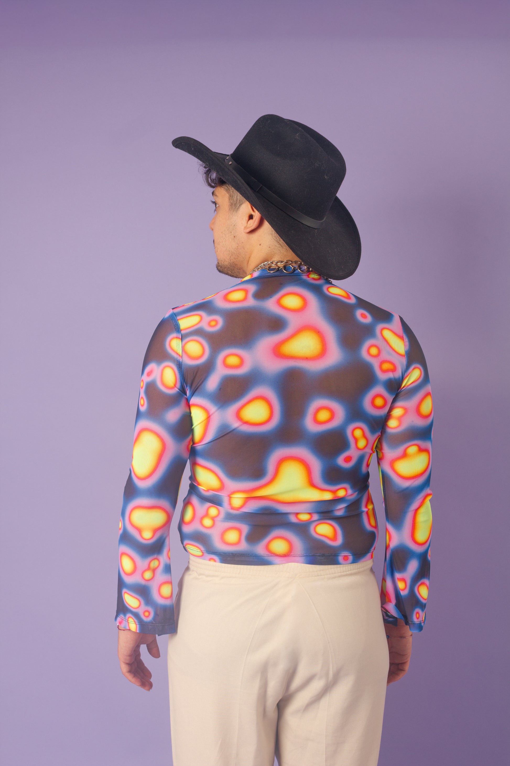 Blusa de mesh transparente que juega con colores vibrantes y un toque groovy. Su manga campana te da el estilo retro-chic que todas amamos. El tejido translúcido permite capas creativas debajo de la prenda.